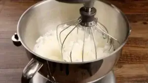 Using a stand mixer with a chilled bowl, whip the heavy cream until it forms stiff peaks. After mixing, set the bowl aside for later.