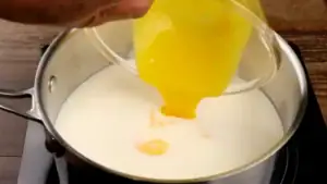 - In a pot over medium-low heat, combine the milk and egg yolks. Whisk them together until well combined.