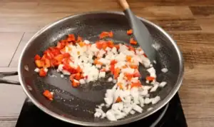 Add the diced onion and red bell pepper to the bacon fat in the skillet. Sauté for about 2−3 minutes until the onions become soft and translucent.