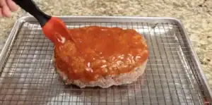 After 30 minutes remove the meat mixture from the refrigerator then form your loaf transfer your loaf to a wire rack then top with the sauce.