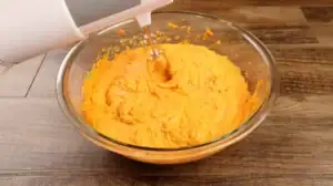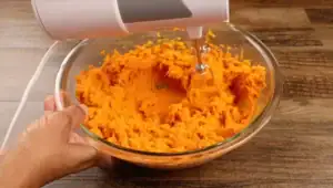 Using a hand mixer, mix the sweet potatoes until they are smooth and creamy.
