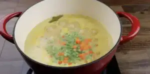 - Cover the Dutch oven and let the soup cook for 10 minutes, allowing the flavors to meld together. After 10 minutes, stir in the frozen peas and carrots.