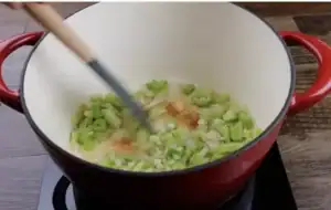 - Heat a Dutch oven over medium heat. Melt the butter in the Dutch oven. Add the chopped onion and celery, sautéing for 2 minutes until they begin to soften. Add the minced garlic and sauté for an additional minute, stirring frequently to avoid burning.