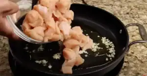 - Heat a pan over medium heat and add the olive oil. Sauté the minced garlic for 1 minute. Add the chicken to the pan and cook for 10-12 minutes until the chicken starts to brown. Remove the chicken from the pan and set aside.