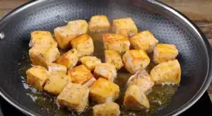 Add the remaining 2 tablespoons of olive oil to a pan. Heat the pan over medium heat. Place the salmon bites in the pan and cook for 2 minutes on each side (4 minutes total). Remove the salmon from the pan and set aside.