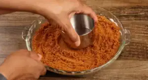 - Press the crumb mixture firmly into a pie dish — covering the bottom and up the sides. Use the back of a spoon or flat measuring cup to help pack it tight.