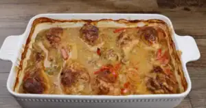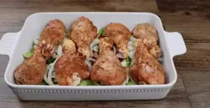 - In a 9×13-inch baking dish, add bell peppers, onion, celery, and garlic. Place chicken on top.