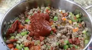 - After 5 minutes add the ground beef, diced tomatoes, tomato paste and beef broth.