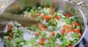 - In a separate pan add the olive oil and saute the onion, celery, red pepper, green pepper and a jalepeno pepper for 5 minutes.