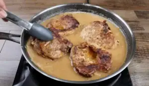 - Return chops (and juices) to the skillet, nestling into the gravy. Reduce heat to medium-low, cover loosely, and simmer 20 minutes, stirring the gravy occasionally, until chops are tender and at least 145°F.